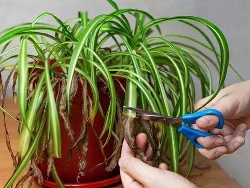 Regelmatig snoeien zorgt ervoor dat je spinplant er op zijn best uitziet. Ik verwijder vergelende of bruin wordende bladeren aan de basis en beschadigde uiteinden.